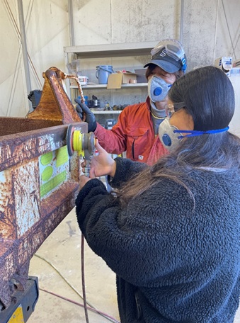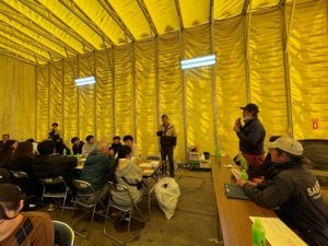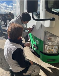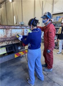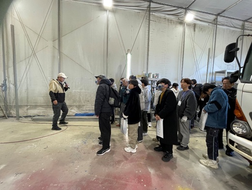 最初に主催の中尾理事長、当社金谷会長より挨拶をした後に、当社の概要を動画で紹介、その後移動しながら職場を案内しました。①レンタル車の法定(3ヶ月)点検作業、②看板はがし作業、ここでは、27名全員にカッターでシールをはがす作業を体験してもらいました。③レンタル車入出庫エリア紹介、④中古車受入、点検、展示エリア紹介、⑤塗装作業、ここでは、全員に保護メガネ、防塵マスクを着用してもらい塗装前にエアーツールで錆を落とす作業を体験してもらいました。